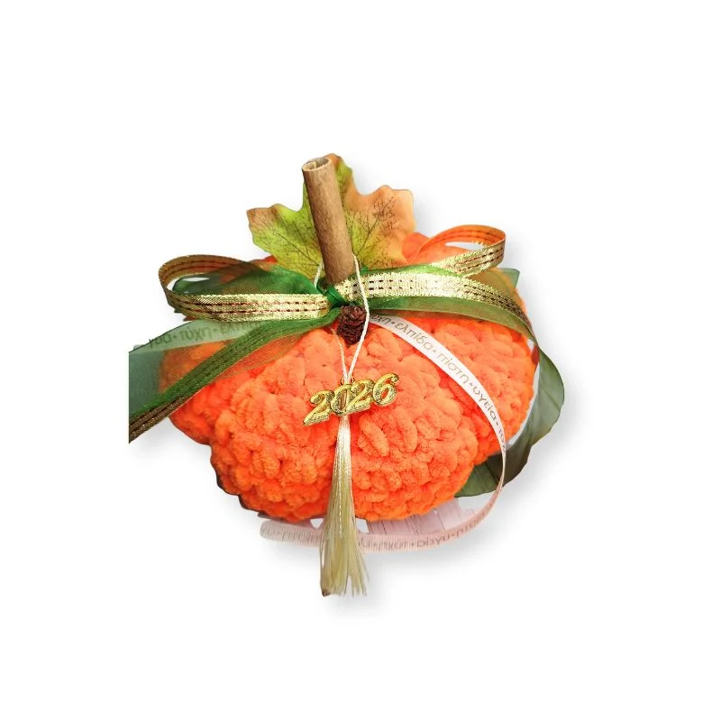 Πορτοκαλί βελούδινη κολοκύθα γούρι (περίπου 16 εκ.), αποτελείται από κανέλα ως κοτσάνι, διακοσμητικό φύλλο, κουκουνάρι, φουντίτσα με μεταλλικό στοιχείο 2026 και διακοσμητικές κορδέλες, για να διακοσμήσετε το σπίτι σας.