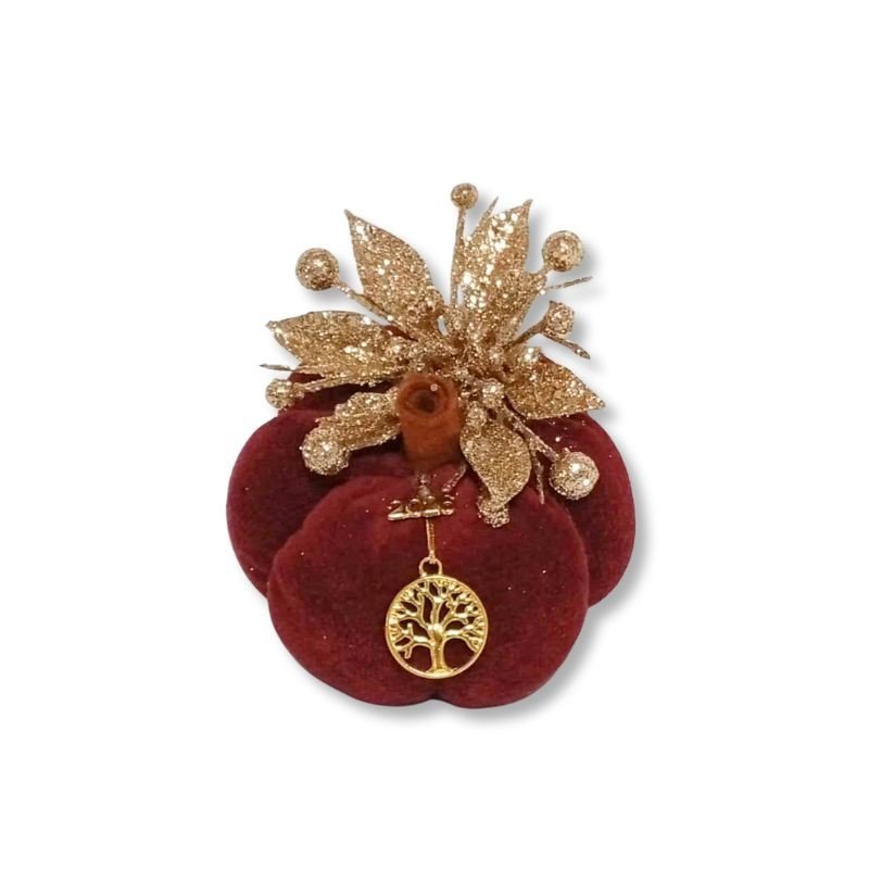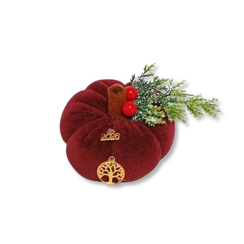 Βελούδινη κολοκύθα–γούρι, φτιαγμένη από ύφασμα άριστης ποιότητας, σε υπέροχο δαμασκηνί χρώμα.