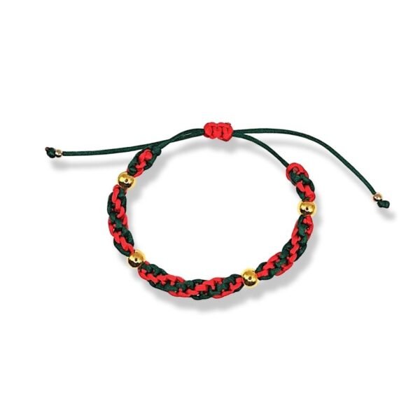 Βραχιολάκι μακραμέ με κορδόνια γυαλιστερά σε πράσινο και κόκκινο, και χαντρούλες σε χρυσό χρώμα με ρυθμιζόμενο μήκος. Αποστέλλεται σε γιορτινή συσκευασία.