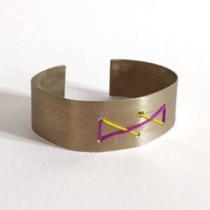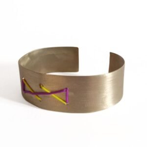 Αυτό το μοναδικό βραχιόλι από αλπακά σε ασημί χρώμα είναι ιδανικό για να προσθέσετε μια ιδιαίτερη πινελιά και παιχνιδιάρικη διάθεση στο στυλ σας. Με πολύχρωμα στοιχεία (κορδόνια σε μωβ και κίτρινο) και τη μοναδική του κατασκευή, φέρνει μια δόση χαράς και