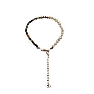 Δίχρωμο βραχιόλι με πολύχρωμες πέτρες και μαργαριτάρι καλλιέργειας. Το βραχιόλι είναι 17 εκ. με προέκταση αλυσίδα 5 εκ. Είναι ένα ιδιαίτερο βραχιόλι ιδανικό για όλες τις ώρες ευκολοφόρετο από το πρωί μέχρι το βράδυ. Ένα ιδανικό δώρο για την μητέρα, την γιαγιά ή την αδελφή και την κόρη.
