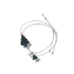 Βραχιόλι γούρι με ασημί στοιχεία. Το κορδόνι που δένει στο χέρι είναι κερωμένο σε ασημί χρώμα και αυτό. Το μακραμέ δεντράκι διατίθεται σε δύο χρώματα, κόκκινο σκούρο και πράσινο σκούρο.