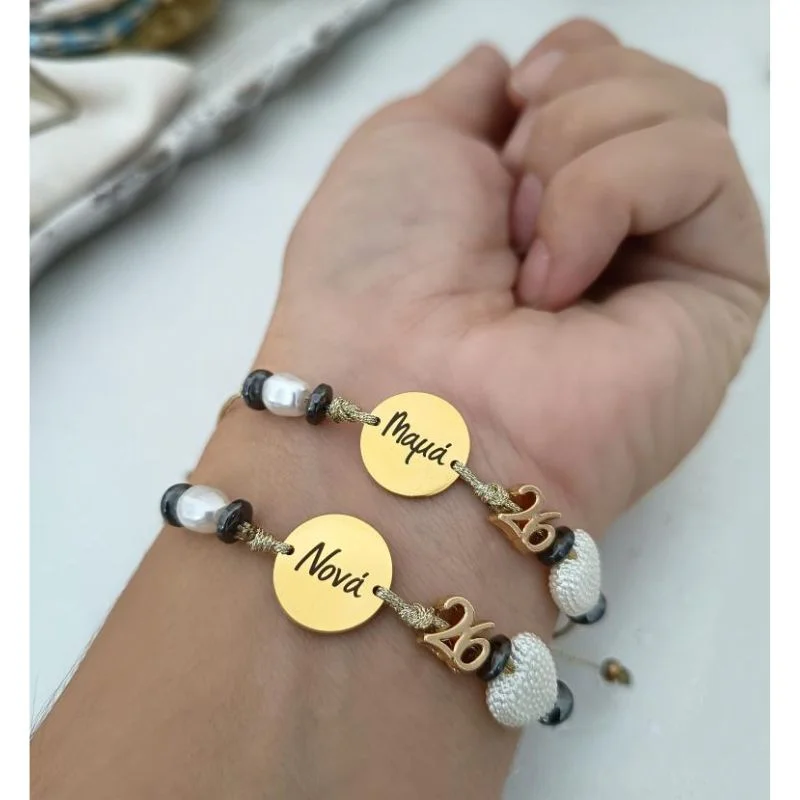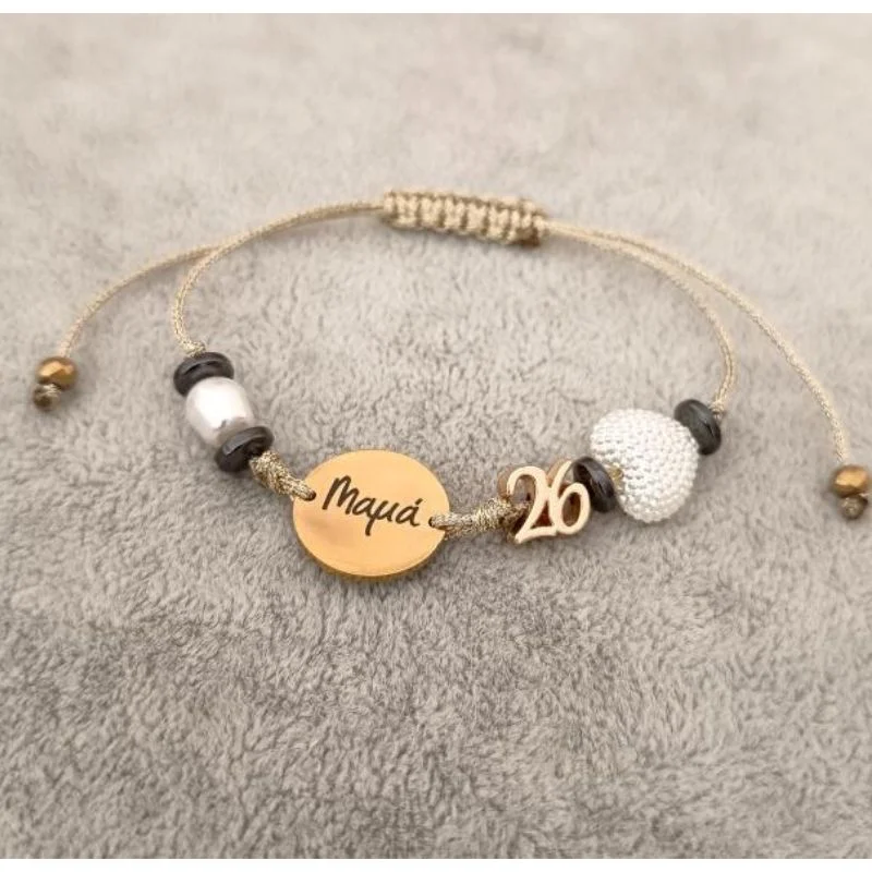 Με το 26 επάνω και χάντρες αιματίτη, καρδιά και πέρλες με εφέ μαργαριταριού και με κλείσιμο μακραμέ για να ταιριάζει σε κάθε καρπό.