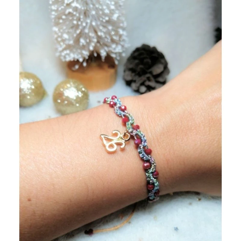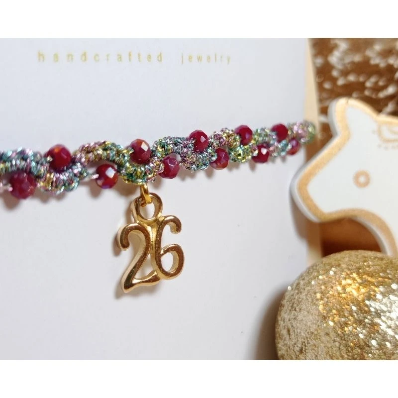 Το χειροποίητο γούρι σας, ιδανικό για να σηματοδοτήσει μια ξεχωριστή ημερομηνία! Βραχιόλι πλεκτό (μακραμέ) με ιριδίζουσες κόκκινες χάντρες και κεντρικό χρυσό μεταλλικό γούρι με τον αριθμό ’26’.