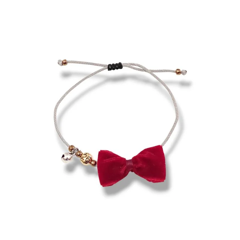 Βραχιόλι γούρι, χριστουγεννιάτικο κόσμημα, με χειροποίητο κόκκινο φιογκάκι από βελούδο και επίχρυσα στοιχεία, περασμένα σε γκρι κορδόνι. Το κουδουνάκι σε ασημί χρώμα του δίνει μια έξτρα γιορτινή όψη.
