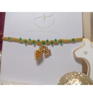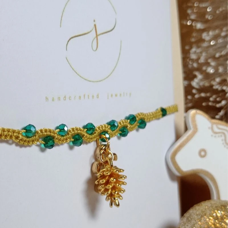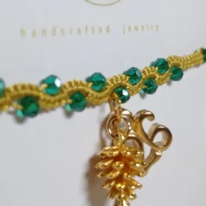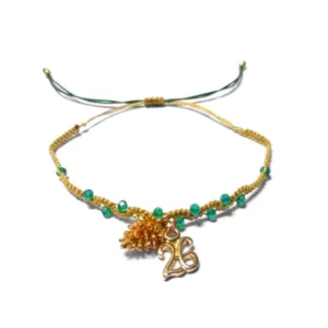 Κατασκευασμένο από ανθεκτικό κορδόνι και λαμπερά πράσινα κρύσταλλα Αυστρίας, διαθέτει δύο εντυπωσιακά χρυσά μεταλλικά στοιχεία: ένα λεπτομερές κουκουνάρι (σύμβολο αφθονίας) και τον τυχερό αριθμό 26.