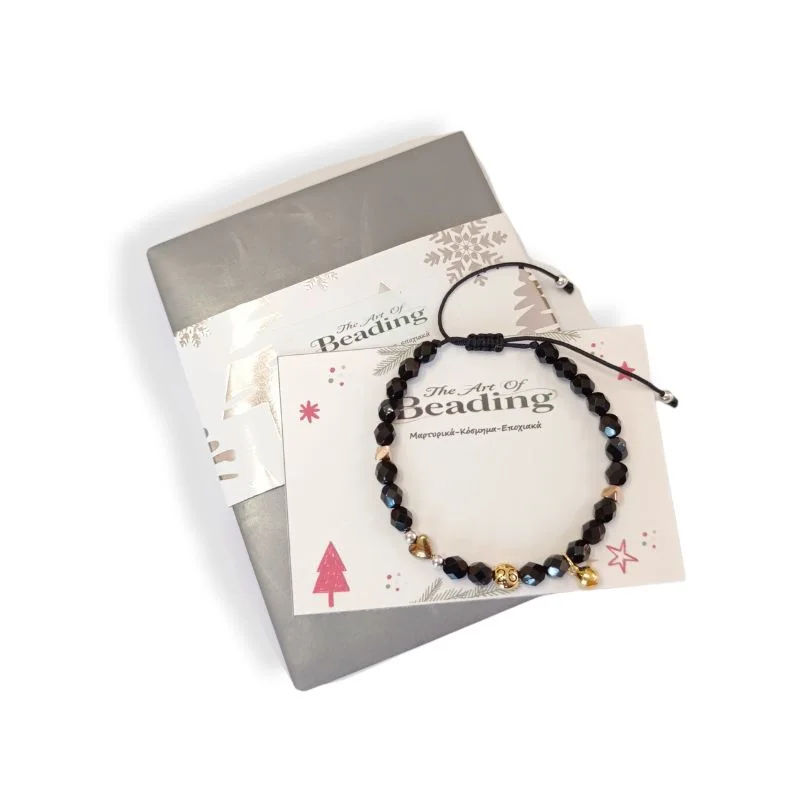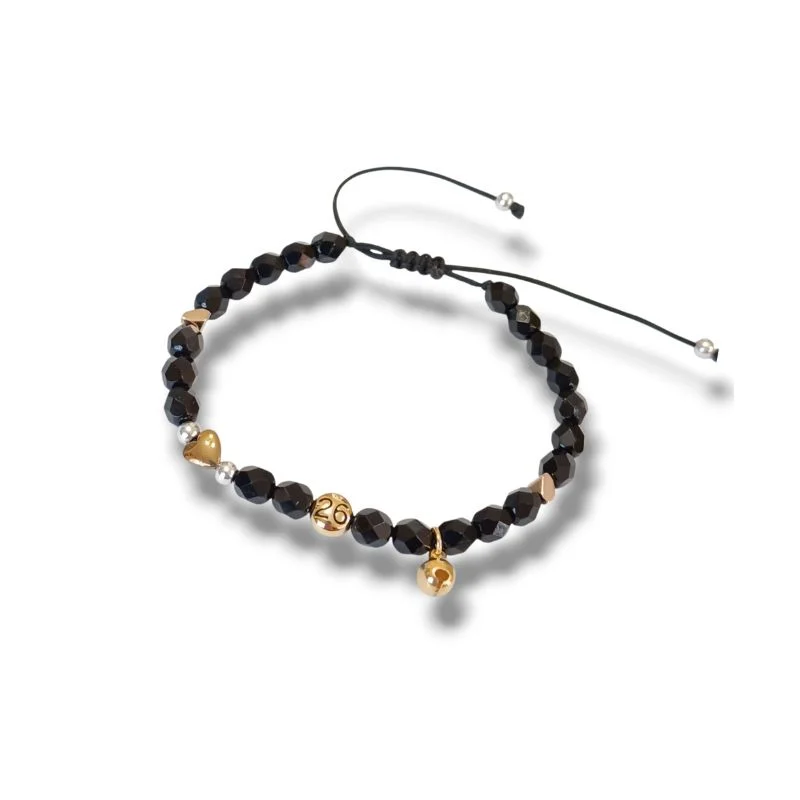 Βραχιόλι με μαύρα κρύσταλλα, μεταλλικό στοιχείο ’26 καρδούλα και κουδουνάκι που δίνει ένα γιορτινό τόνο στο κόσμημα.