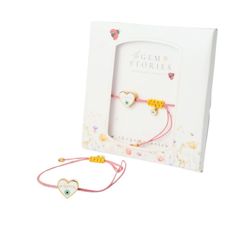 Χειροποίητο βραχιόλι με κορδόνι και μεταλλική καρδιά με τη λέξη «Μάρτης» και ματάκι στο κέντρο. Ένα τρυφερό και συμβολικό κόσμημα που εκφράζει αγάπη και προστασία. Ρυθμιζόμενο για να προσαρμόζεται σε κάθε καρπό και ιδανικό για δώρο στη μητέρα