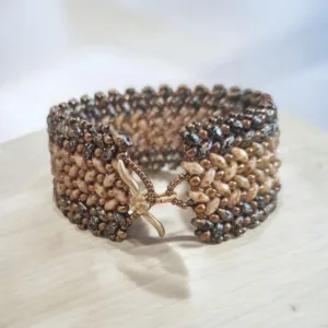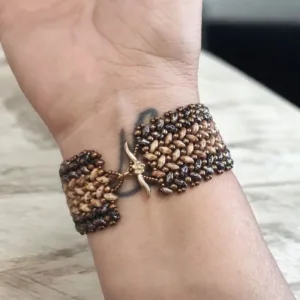 Βραχιόλι σε χρυσό και μαύρο χρώμα, κεντημένο με ιαπωνικές χάντρες και πολύ ανθεκτικό νήμα, ειδικό γι’ αυτή την τεχνική. Το φάρδος του είναι 2,5εκ και το μήκος 17εκ.