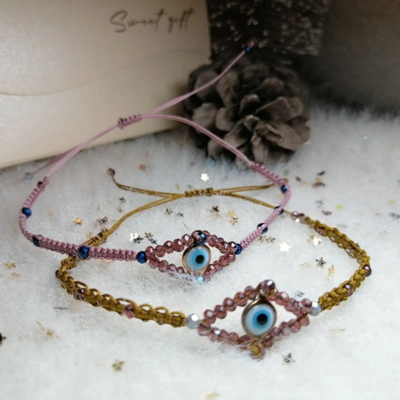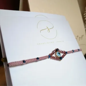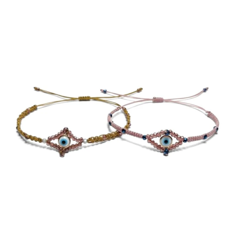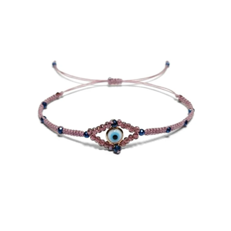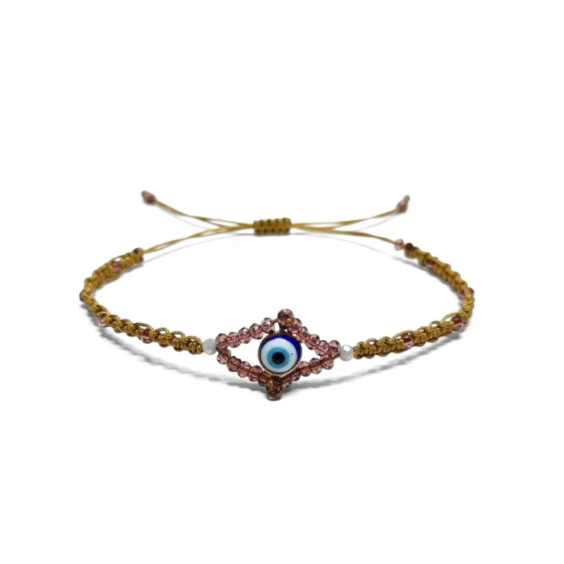 Αποκτήστε το δικό σας φυλαχτό με αυτό το κομψό βραχιόλι μακραμέ Μάτι. Το κεντρικό του στοιχείο είναι το κλασικό μπλε μάτι που περιβάλλεται από μικρά, λαμπερά κρύσταλλα, σχηματίζοντας έναν εντυπωσιακό ρόμβο.