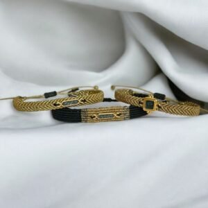 Χειροποίητο μακραμέ βραχιόλι σε χρώμα χρυσό μεταλιζέ με στοιχείο μπάρα σε μαύρους glitter τόνους.