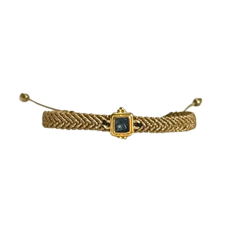 Χειροποίητο βραχιόλι μακραμέ σε χρώμα χρυσό μεταλιζέ με έθνικ τετράγωνο στοιχείο. Το μέταλλο είναι ορείχαλκος.