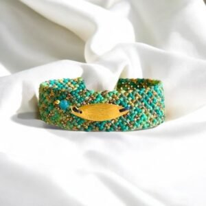Ένα βραχιόλι φτιαγμένο με την αγαπημένη μου τεχνική μακραμέ, πλεγμένο στο χέρι με 4 αποχρώσεις πράσινου κερωμένου νήματος και με μια λάμψη από χρυσό μεταλιζέ χρώμα. Φτιαγμένο με αγάπη για τη λεπτομέρεια, αυτό το βραχιόλι συνδυάζει απλότητα και στυλ.