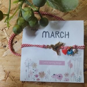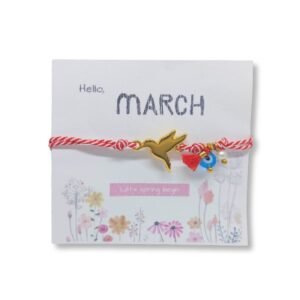 Βραχιόλι μαρτάκι με κόκκινο-λευκό κορδόνι και επιχρυσωμένο στοιχείο κολύμπρι, ματάκι, μαργαριτάρι & κόκκινο φουντάκι.