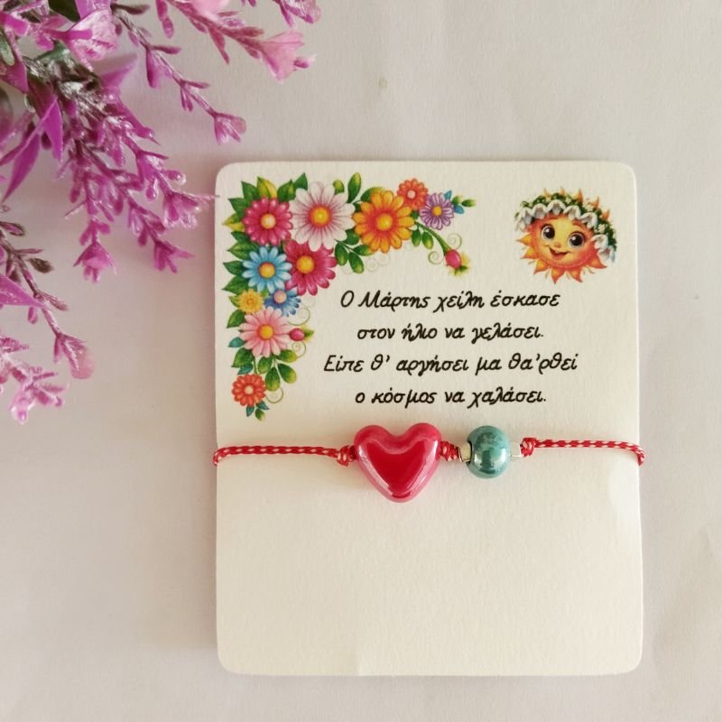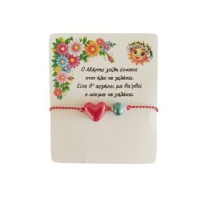 Βραχιόλι μαρτάκι με κεραμική κόκκινη καρδιά και γαλάζια χάντρα