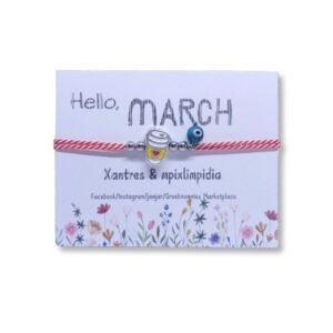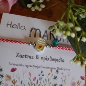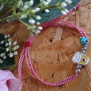 Βραχιόλι μαρτάκι με κορδόνι κόκκινο-λευκό με επάργυρο στοιχείο ποτήρι καφέ με σμάλτο, ματάκι & χάντρες χαολίτη και αιματίτη.