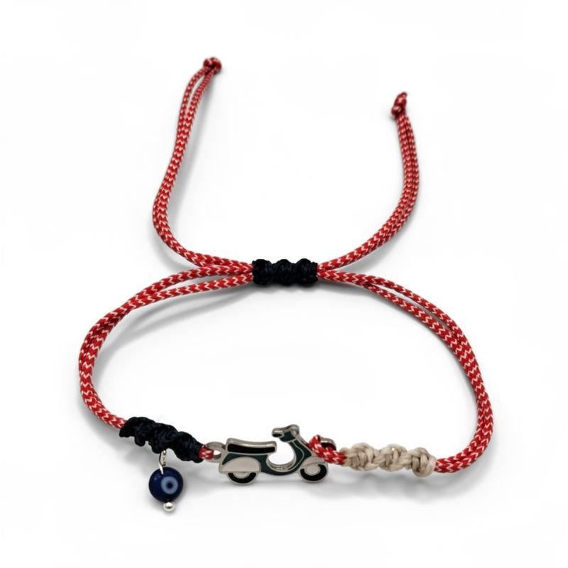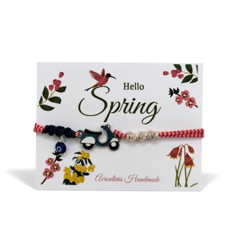 Ένα μαρτάκι με κορδόνι κόκκινο και λευκό και μεταλλικό διακοσμητικό μια βέσπα βαμμένη με σμαλτό σε τυρκουάζ, λευκό και μαύρο.