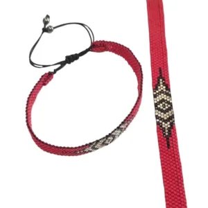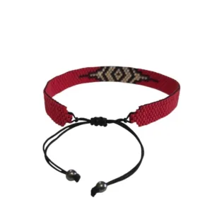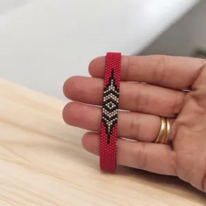 Λεπτό βραχιόλι σε κόκκινο χρώμα, 10mm στο φάρδος, κεντημένο στο χέρι με χάντρες miyuki. Για το μοτίβο έχουν χρησιμοποιηθεί μαύρες και ασημί χάντρες.