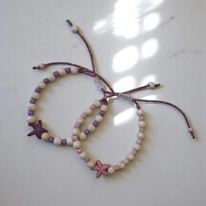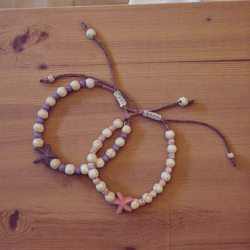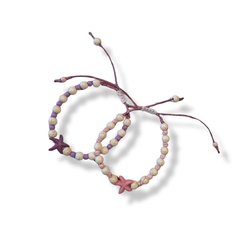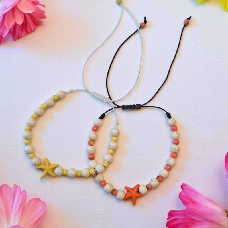 Χειροποίητο καλοκαιρινό βραχιόλι με όμορφα χρώματα. Σε διάφορους συνδυασμούς. Ροζ με λευκό, πορτοκαλί με λευό, κίτρινο με λευκό, μωβ με λευκο. Φτιαγμένο με χαολίτη σε μορφή πέρλας. Ενας αστερίας στην μέση φέρνει το καλοκαίρι. Ελαφρύ και ευκολοφόρετο.