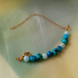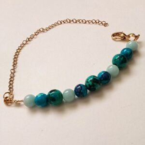 Βραχιόλι με ατσάλινη αλυσίδα σε χρυσαφί χρώμα, ημιπολύτιμες πέτρες χαολίτη σε αποχρώσεις του μπλε-γαλάζιου με εντυπωσιακά “νερά” και ίασπη σε ανοιχτό γαλάζιο, δεμένα με ατσαλόσυρμα.