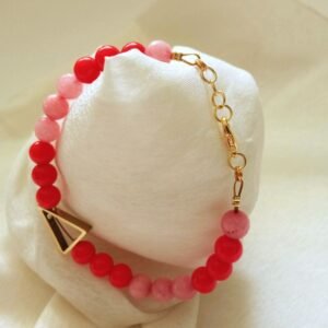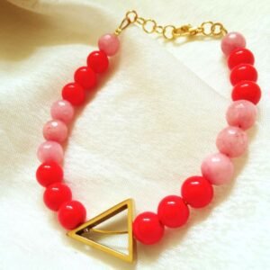 Γυναικείο βραχιόλι, με ατσάλινο στοιχείο τρίγωνο σε χρυσαφί χρώμα, ημιπολύτιμες πέτρες ροζ νεφρίτη και πέτρες από γυαλί σε κόκκινο (κοραλί) δεμένα με ατσαλόσυρμα.