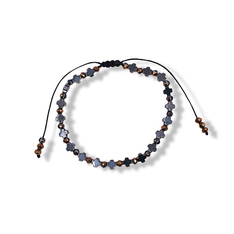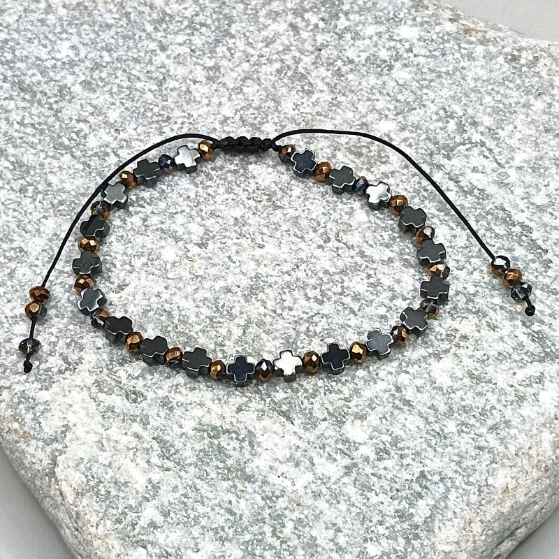 Βραχιόλι με σταυρουδάκια μικρά σταυρουδάκια αιματίτη τετράγωνα και κρυσταλλάκια. Ρυθμιζόμενο μήκος