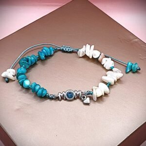 Βραχιόλι για τη μαμά με μεταλλικό MOM με glitter σε έντονο γαλάζιο. Φυσικό φίλντισι λευκό και γαλάζιο σε τσιπς και κρυσταλλάκια γεμάτα λάμψη. Ρυθμιζόμενο μήκος. Ιδανικό διαχρονικό κοσμηματάκι για μαμάδες.