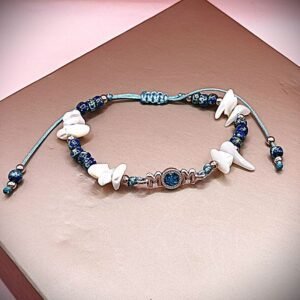 Βραχιόλι για τη μαμά με μεταλλικό MOM με glitter σε έντονο γαλάζιο. Φυσικό φίλντισι λευκό σε τσιπς και γυάλινες χαντρούλες. Ρυθμιζόμενο μήκος. Ιδανικό διαχρονικό κοσμηματάκι για μαμάδες.