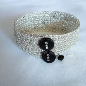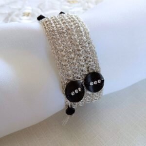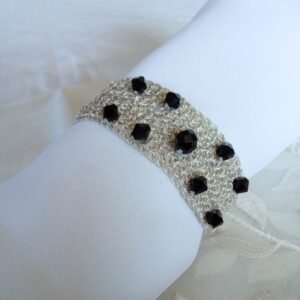 Βραδινό βραχιόλι, σε ασημί χρώμα, πλεγμένο με βελονάκι με κλωστή μεταλιζέ και κεντημένα κρύσταλλα σε μαύρο χρώμα. Το βραχιόλι κλείνει με μαύρα κουμπιά με στρας.