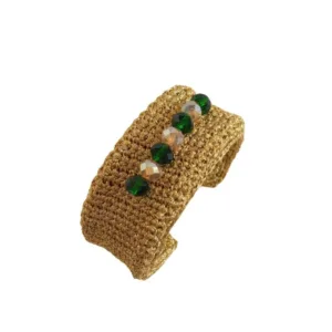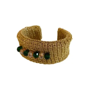 Βραχιόλι, σε χρυσό χρώμα, πλεγμένο με βελονάκι από νήμα μεταλιζέ, πάνω σε μεταλλική χειροπέδα, σε χρυσό χρώμα και κεντημένα κρύσταλλα σε πράσινο και μπεζ.