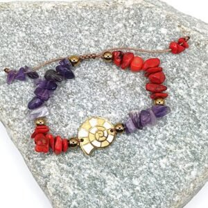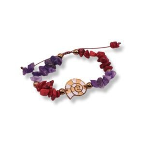 Βραχιόλι με ατσάλινο κοχύλι σε λευκό και χρυσό χρώμα, τσιπς Αμέθυστου Κοραλιού, επιχρυσωμένες χάντρες αιματίτη και κορδόνι συνθετικό σε γυαλιστερό ανοικτό καφέ χρώμα με ρυθμιζόμενο μήκος.