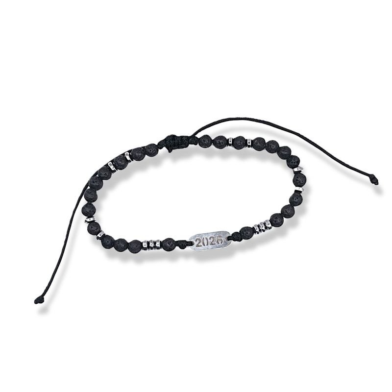 Πλακέτα ατσάλινη με χαραγμένο 2026 σε ασημί χρώμα, μαύρη λάβα και ροδέλες επιμεταλλωμένου αιματίτη.
