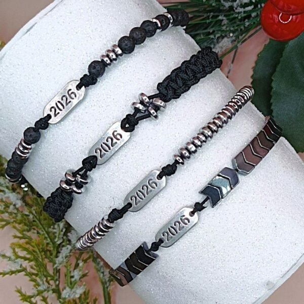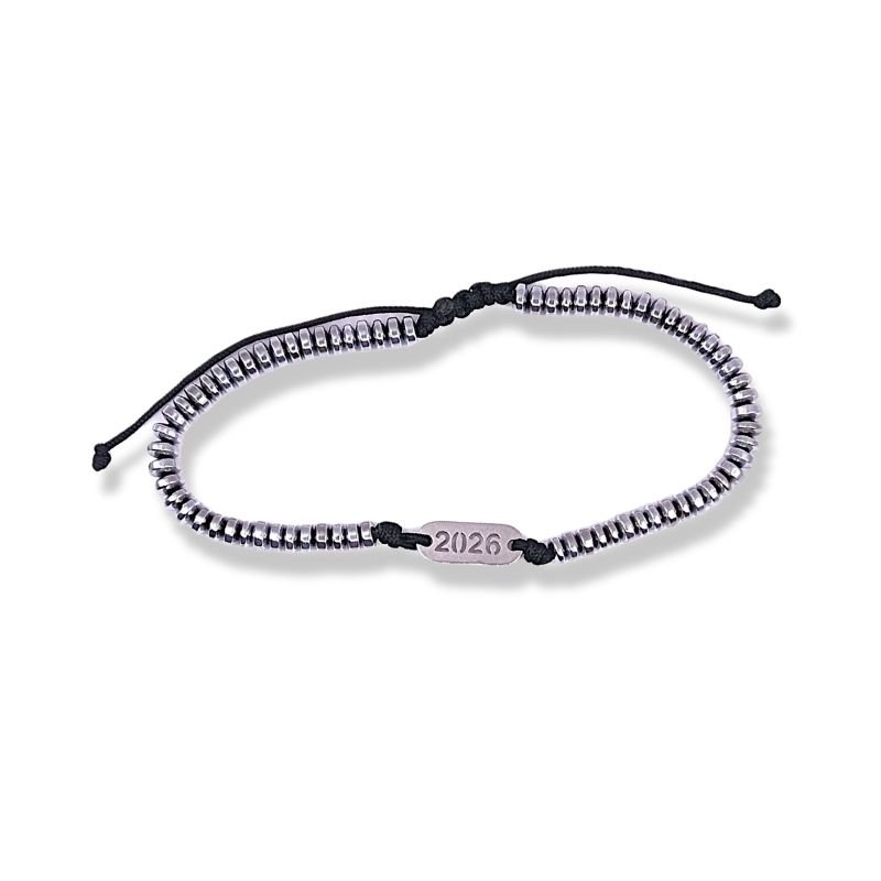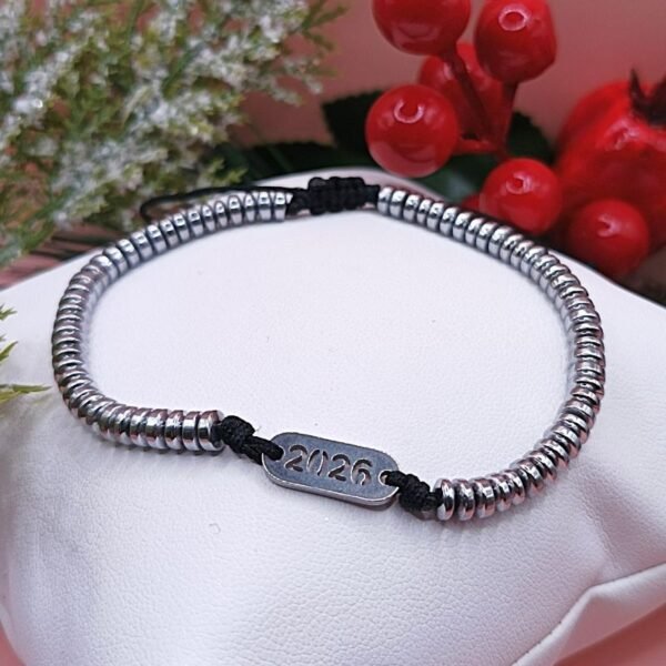 Πλακέτα ατσάλινη με χαραγμένο 2026 και επιμεταλλωμένου αιματίτης ροδέλες σε ασημί χρώμα σε βραχιόλι unisex με ρυθμιζόμενο μήκος. Κλασικό βραχιόλι γούρι για τη Νέα Χρονιά, Αποστέλλεται σε γιορτινή συσκευασία