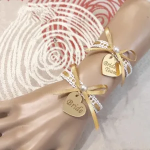 Βραχιόλια bride, bride team και sister of the bride με λευκή βαμβακερή δαντέλα και χρυσή κορδέλα. Είναι αυξομειούμενα για να ταιριάζει σε όλα τα χέρια. Η καρδιά με τη χάραξη είναι πλέξιγκλας χρυσός καθρεφτης. Στις παραλλαγές υπάρχουν τρεις επιλογές bride, bride team και sister of the bride. Η τιμή είναι για το ένα βραχιόλι. Θα τα παραλάβετε συσκευασμένα σε κουτί.