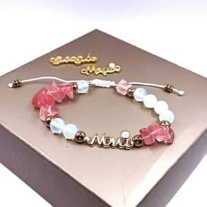 Βραχιόλι για τη Νονά, με μεταλλικό στοιχείο Νονά με ματάκι σε χρυσό χρώμα, και ημιπολύτιμους λίθους διάφανης Φεγγαρόπετρας και τσιπς μεγάλα Ροζ Χαλαζία. Χάντρες αιματίτη σε χρυσό χρώμα. Ρυθμιζόμενο μήκος. Ιδιαίτερο χειροποίητο δώρο σε μοναδικό σχέδιο για τη Νονά.