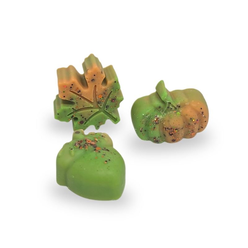 Wax melts (2 τμχ) από 100% φυτικό κερί ελαιοκράμβης σε διάφορα δίχρωμα φθινοπωρινά σχέδια με άρωμα Πικάντικη Σταφίδα, χρώμα μπεζ/πράσινο και glitter.