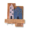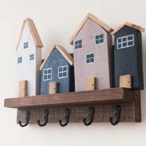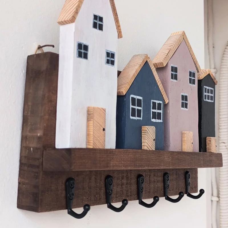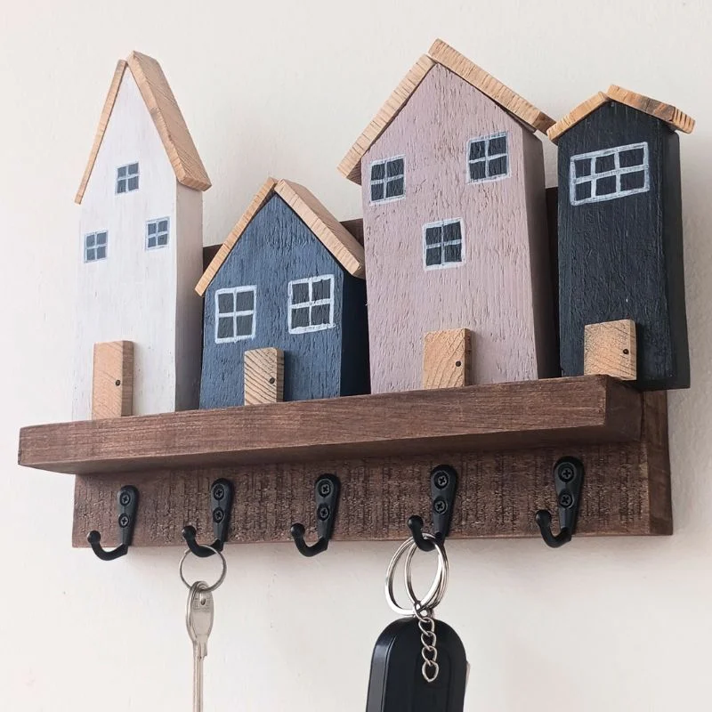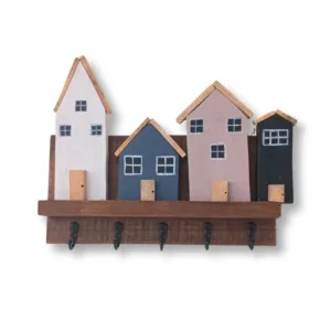 Κλειδοθήκη ξύλινη με 4 ξύλινα σπιτάκια. Το μήκος είναι 27 εκατοστά, το ύψος 21 εκατοστά και το βάθος 6 εκατοστά.