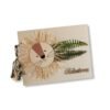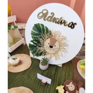 Η ξύλινη πινακίδα είναι διακοσμημένη με λιονταράκι ζωγραφισμένο στο χέρι και τεχνητά φύλλα monstera.