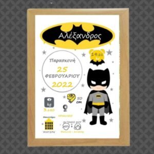Ξύλινο κάδρο με όνομα & τα στοιχεία γέννησης, “Άνθρωπος Νυχτερίδα” (42×32εκ.)