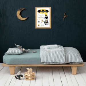 Προσωποποιημένο ξύλινο κάδρο σε φυσικό χρώμα με το όνομα και στοιχεία γέννησης με θέμα ” Άνθρωπος Νυχτερίδα ” .