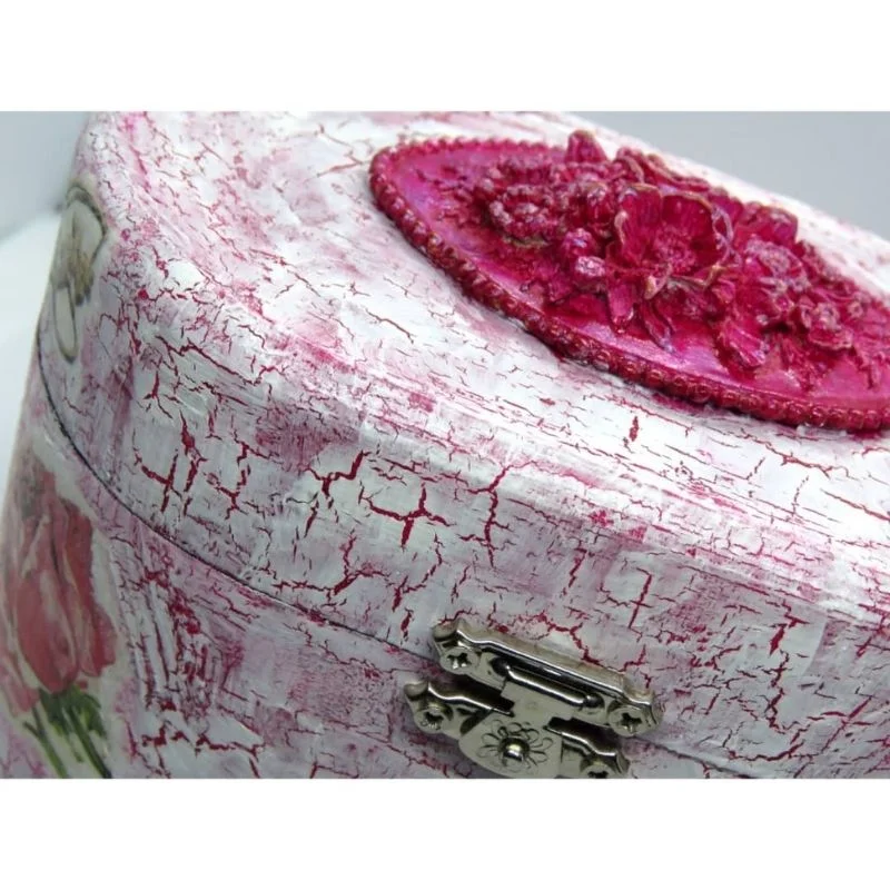 Ξύλινο κουτί μπιζουτιέρα κρακελέ με λουλούδια φούξια, λευκό χειροποίητο