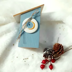 Χειροποίητο επιτραπέζιο διακοσμητικό ξύλινο σπιτάκι – γούρι, διακοσμημένο με πήλινο στοιχείο ματάκι, ξύλινη σκεπή με εκτύπωση σε φύλλο καμβά και κορδονάκια.
