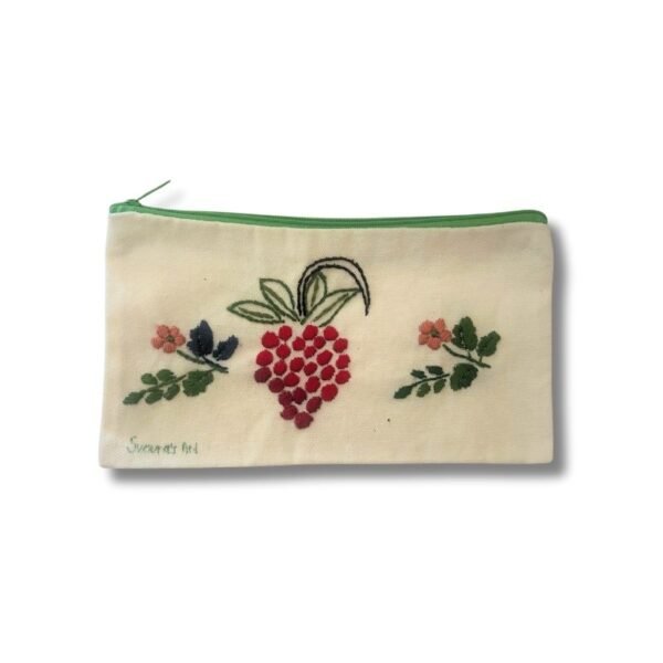 Χειροποίητη υφασμάτινη κασετίνα κεντημένη πάνω σε βαμβακερό ύφασμα, με μοναδικό σχέδιο κόκκινα σταφύλια.