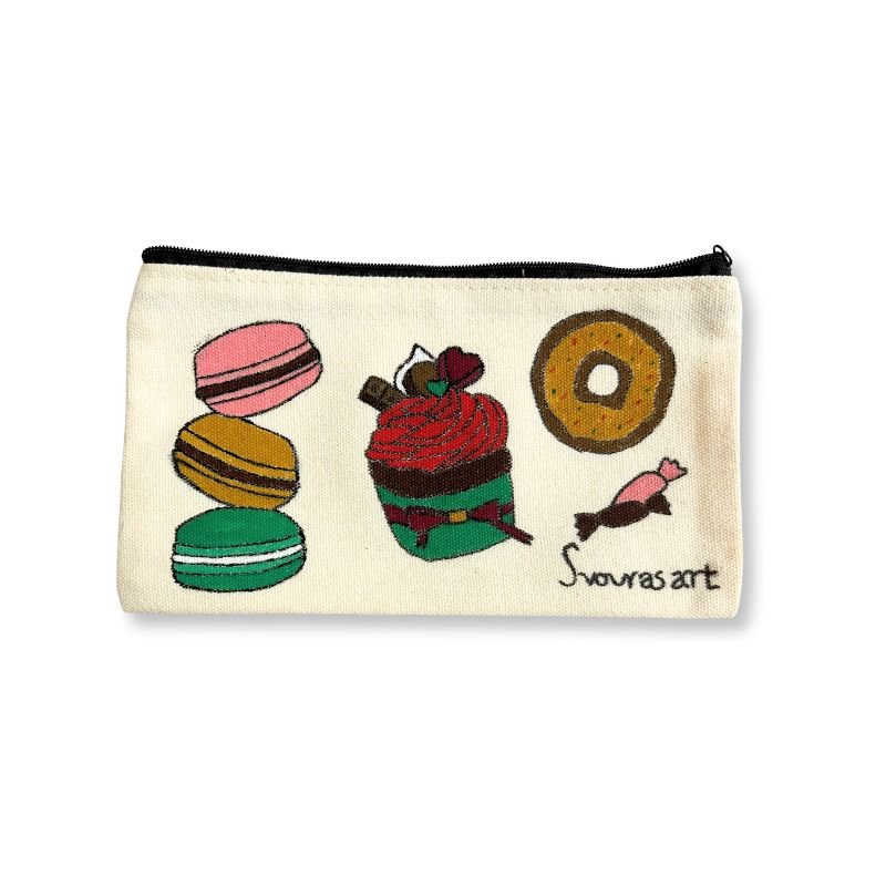 Χειροποίητη υφασμάτινη κασετίνα/νεσεσέρ ζωγραφισμένη με ακρυλικά χρώματα πάνω σε βαμβακερό ύφασμα, με μοναδικό σχέδιο με γλυκάκια.