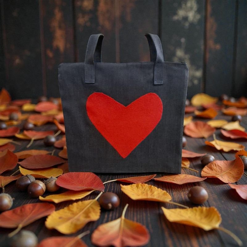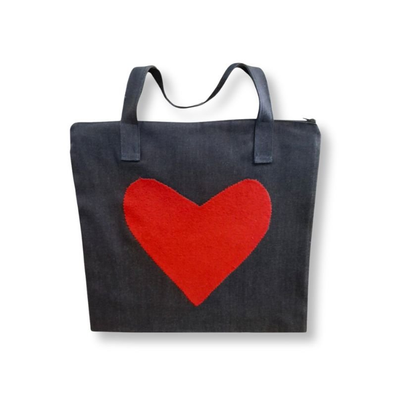 Χειροποίητη τσάντα tote μπλε σκούρο τζιν με μια μεγάλη κόκκινη καρδιά. Μια τσάντα που μπορεί να σταθεί δίπλα μας σε όλες τις δουλειές μας. Για το laptop, για τα ψώνια, αντί της κλασικής μας τσάντας. Ομορφη και εξυπηρετική. Με εσωτερική επένδυση και φερμουάρ. Οι διαστάσεις της είναι περίπου 40 εκατ * 30 εκατ.